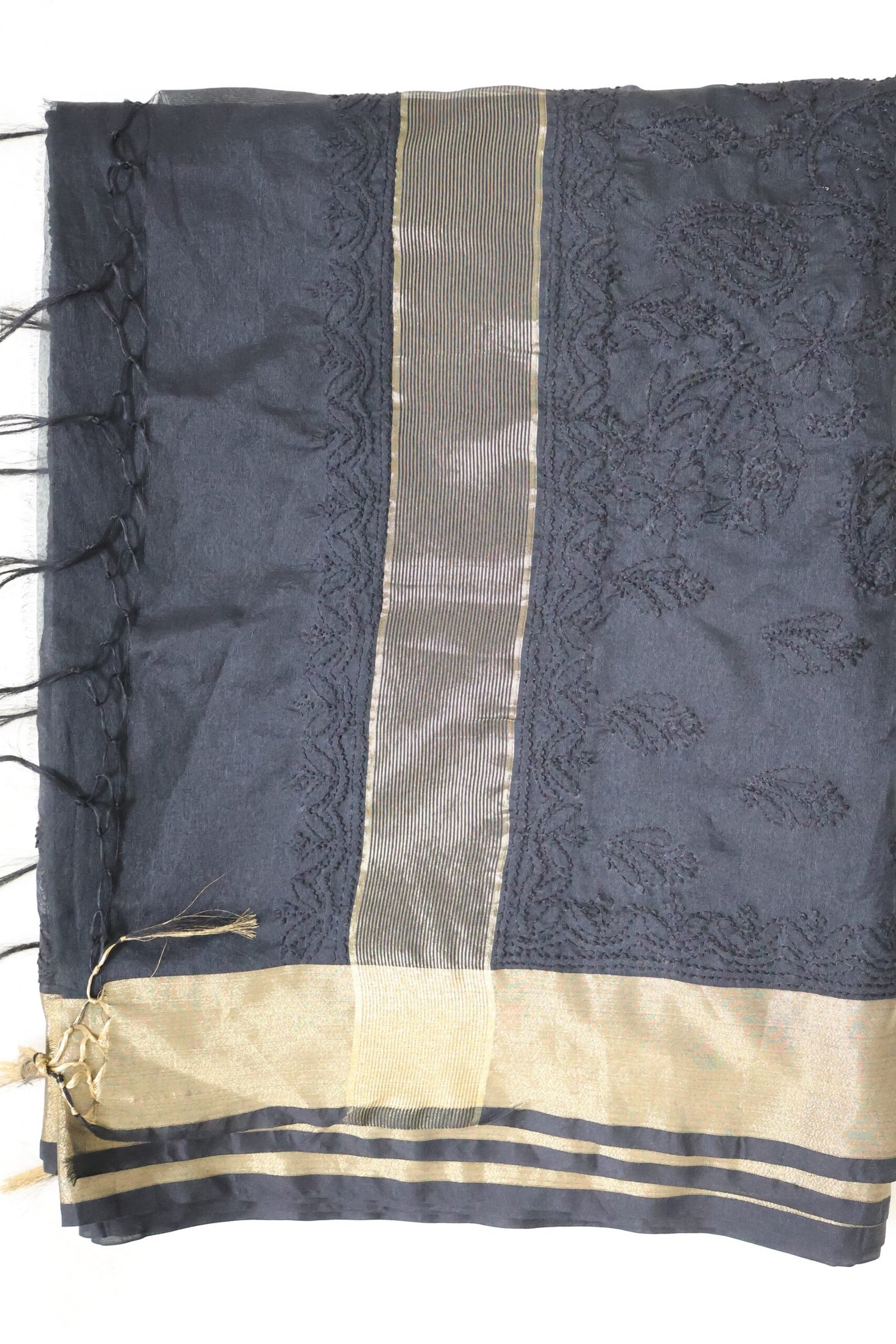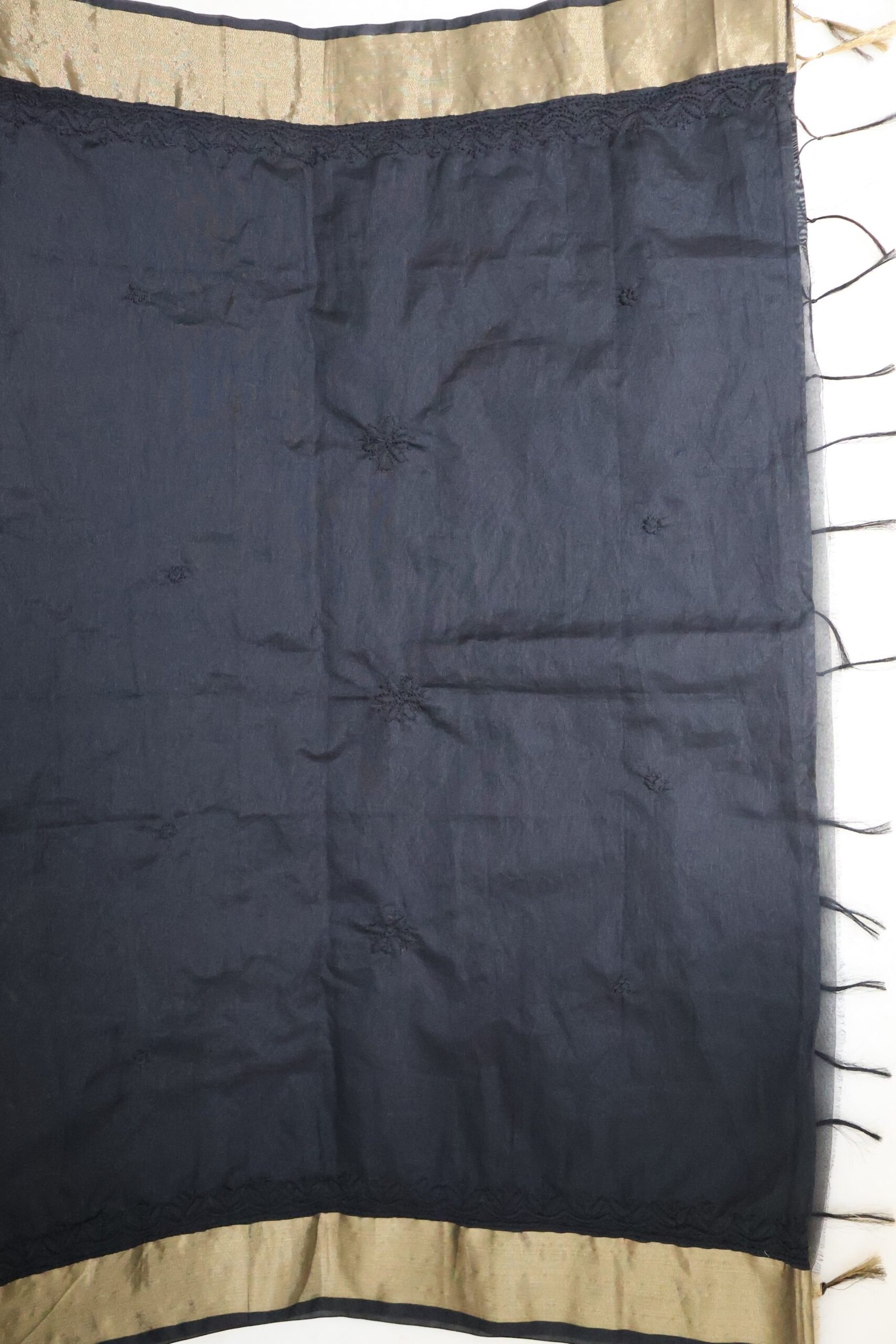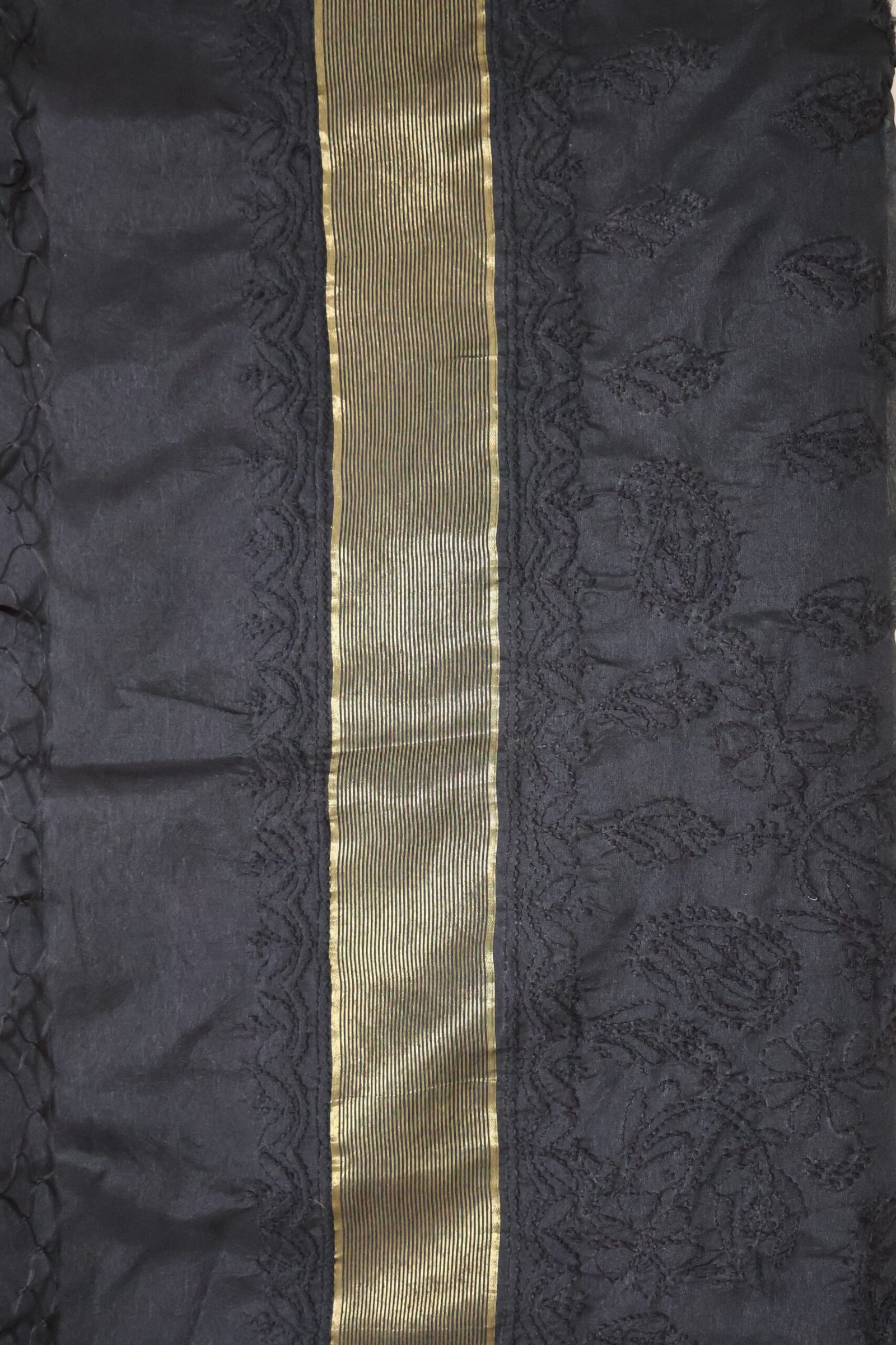 Experience the beauty of traditional craftsmanship with this elegant Black Chanderi Silk Chikankari Saree from PureWear Creations. Crafted on premium Chanderi silk fabric, this saree showcases delicate Lucknowi Chikankari hand embroidery spread gracefully across the fabric in intricate floral and paisley motifs. The fine threadwork reflects the timeless artistry of skilled artisans who carefully create each motif using traditional chikankari techniques.