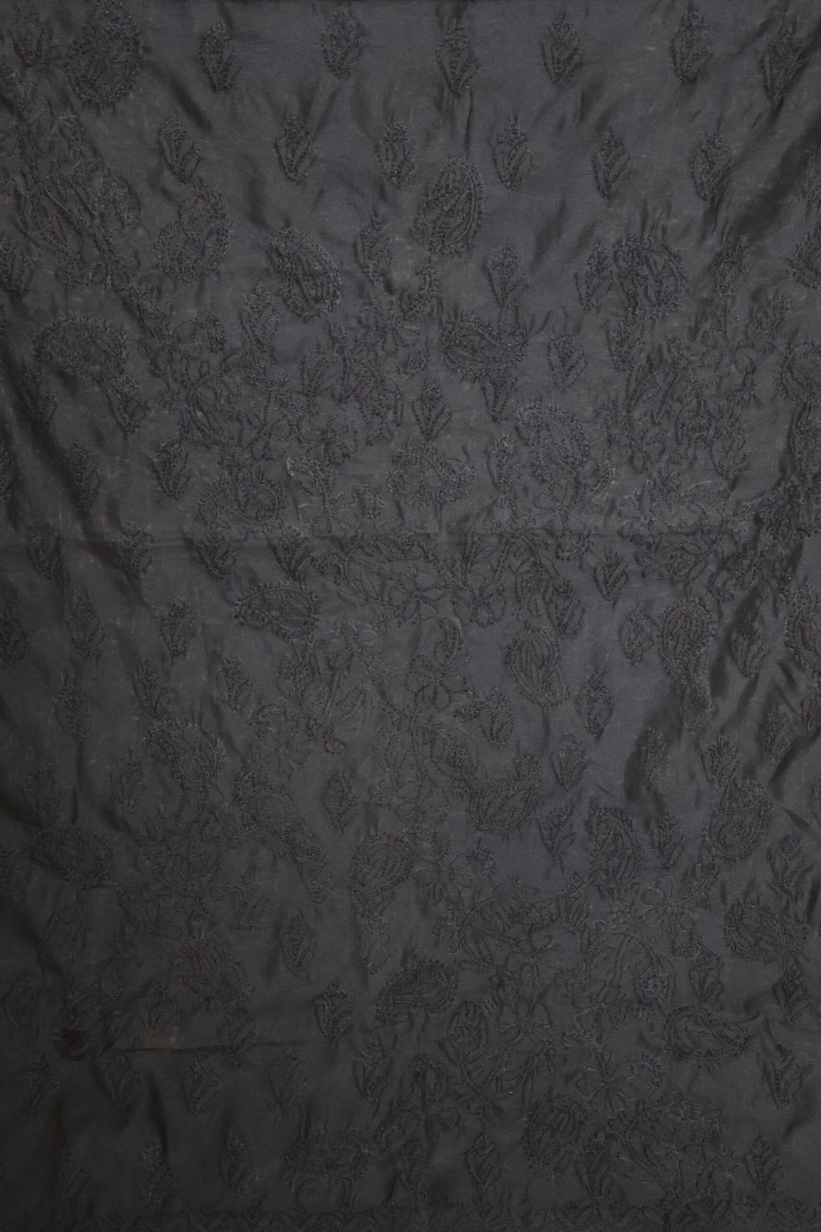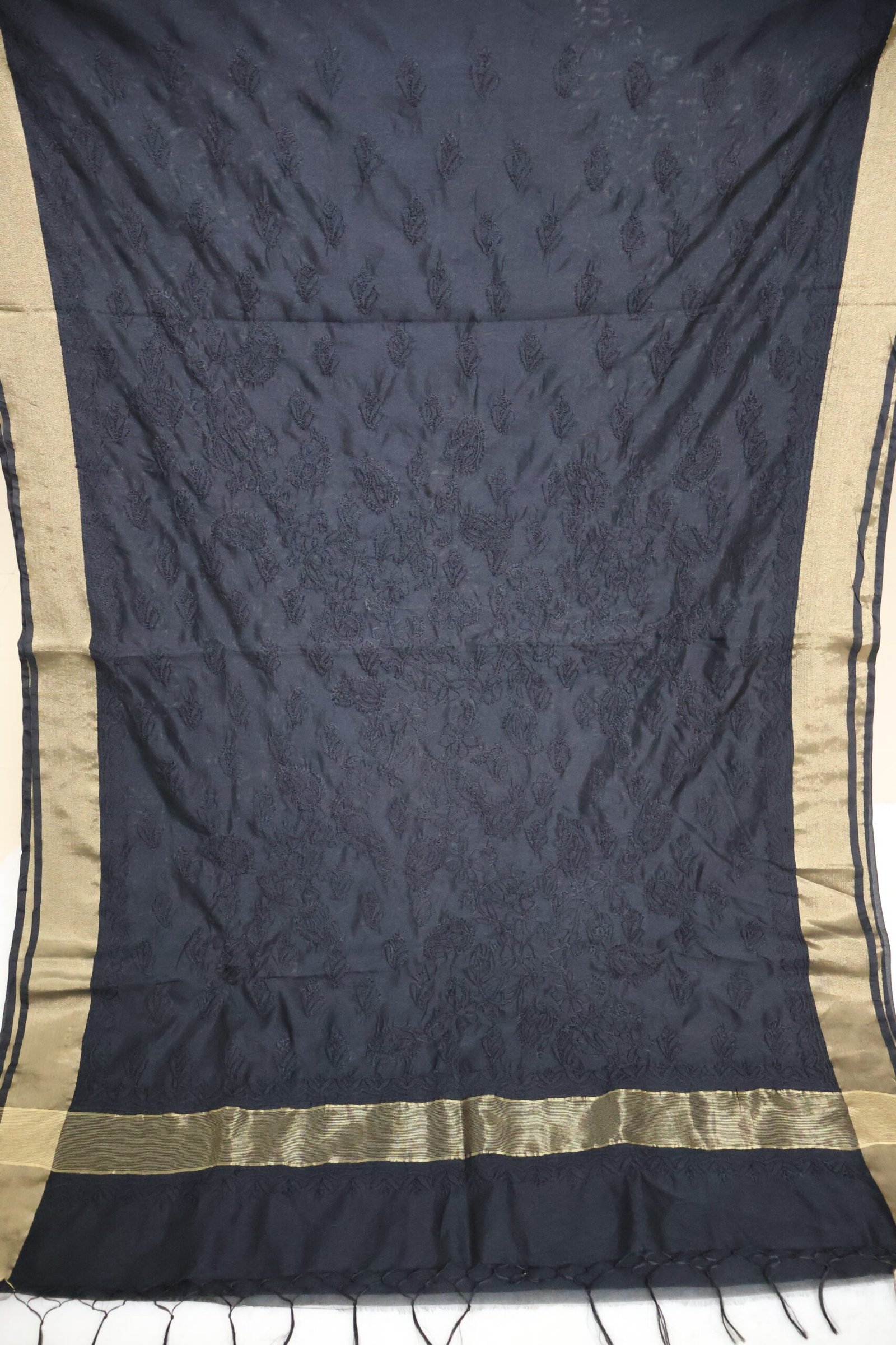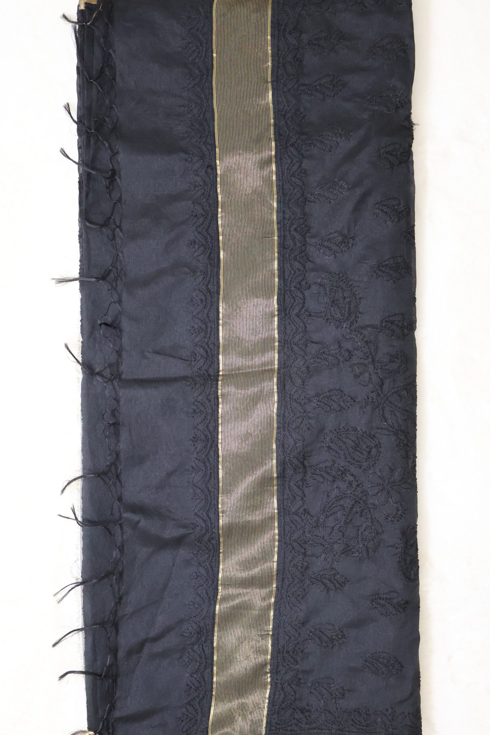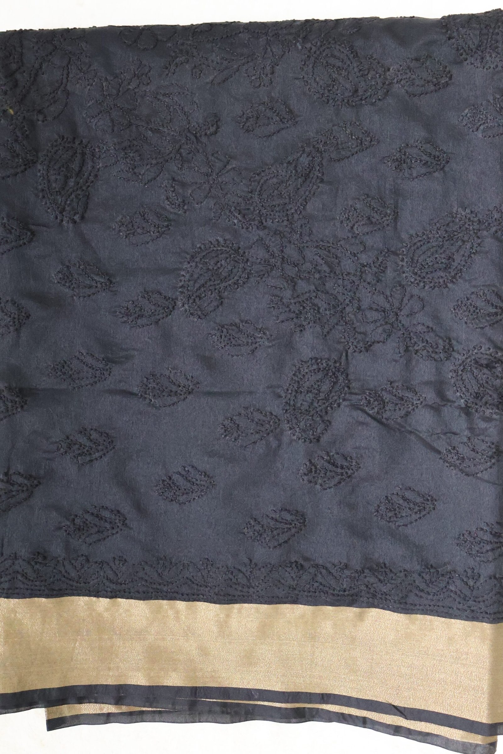 Experience the beauty of traditional craftsmanship with this elegant Black Chanderi Silk Chikankari Saree from PureWear Creations. Crafted on premium Chanderi silk fabric, this saree showcases delicate Lucknowi Chikankari hand embroidery spread gracefully across the fabric in intricate floral and paisley motifs. The fine threadwork reflects the timeless artistry of skilled artisans who carefully create each motif using traditional chikankari techniques.