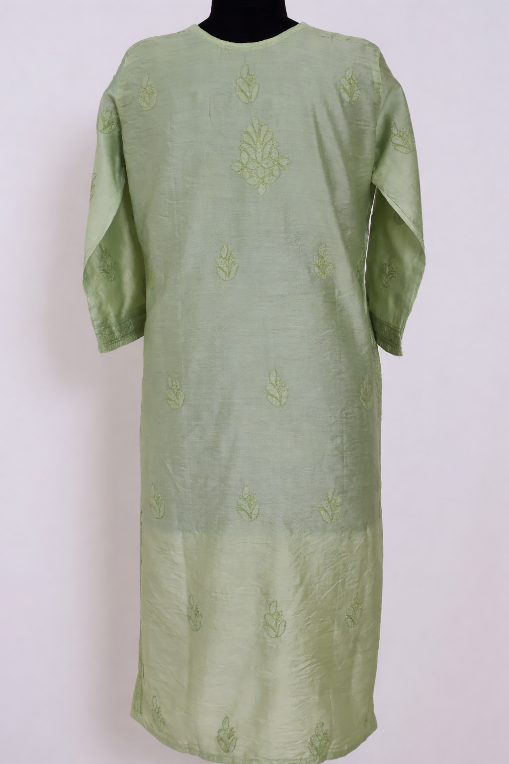 Elevate your ethnic wardrobe with this beautifully handcrafted sage green Chikankari kurti set, designed to bring together elegance and everyday comfort. The kurti features intricate hand embroidery on the front, complemented by subtle motifs that reflect the timeless beauty of traditional Lucknowi craftsmanship. Its soothing pastel shade adds a calm, graceful charm, making it a standout yet versatile piece.