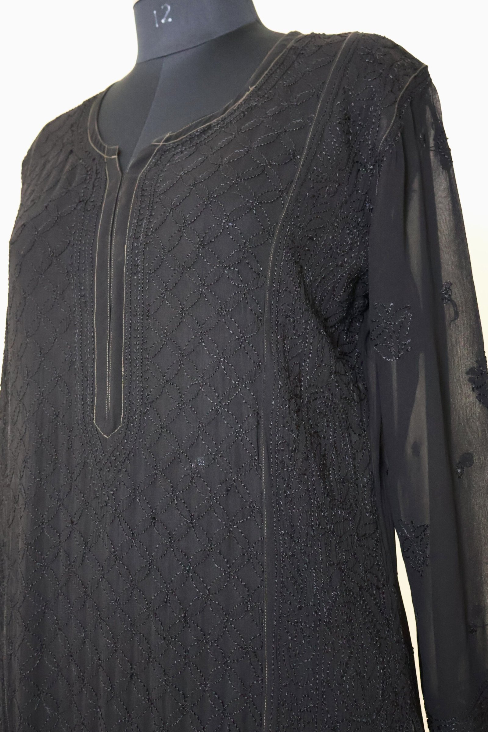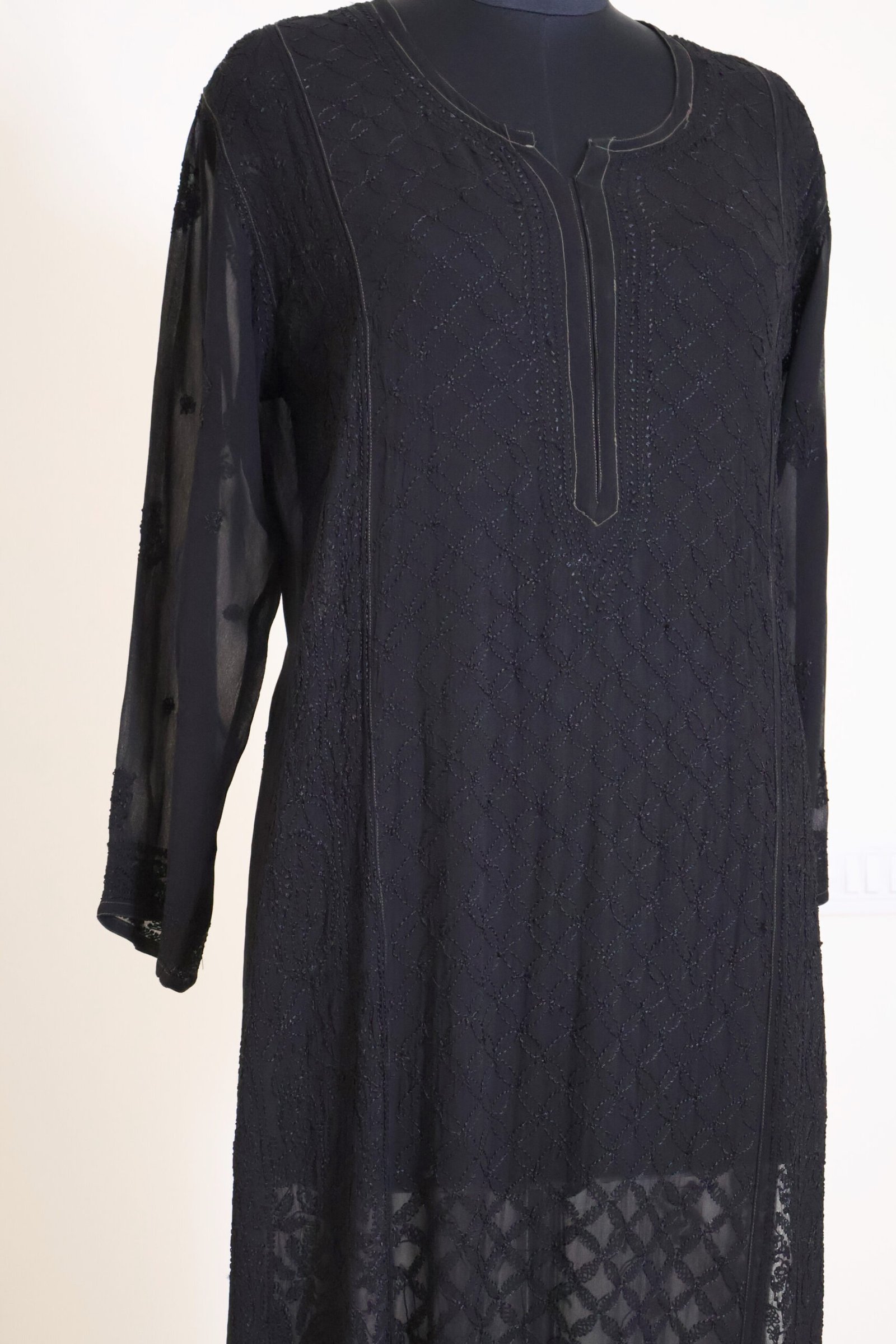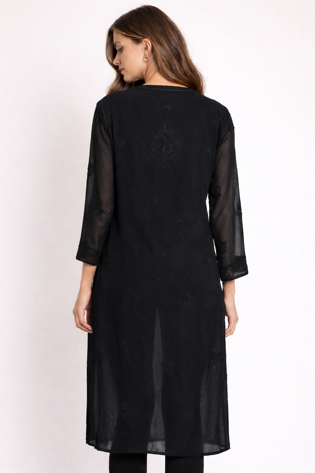 Elevate your ethnic wardrobe with this elegant chikankari georgette kurti designed for timeless grace. Crafted from premium lightweight georgette fabric, this piece showcases intricate handcrafted chikankari embroidery beautifully spread across the silhouette, adding depth and artisanal charm.