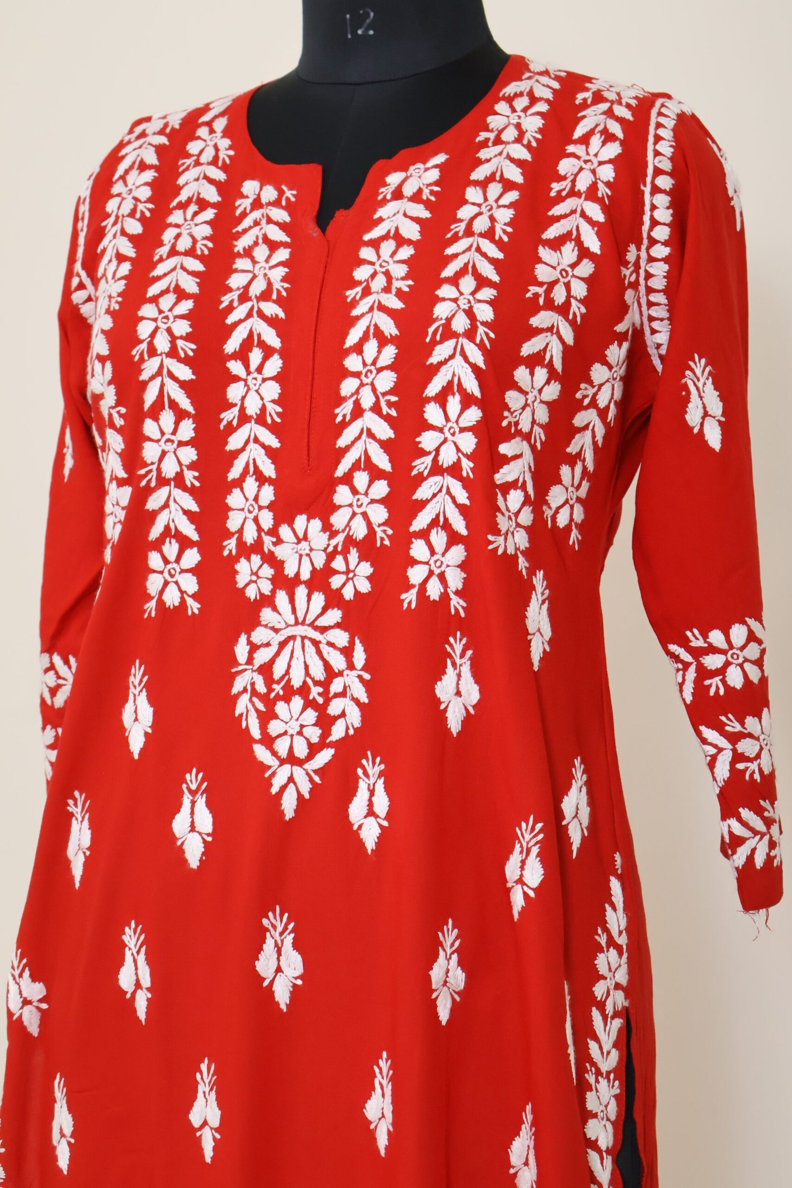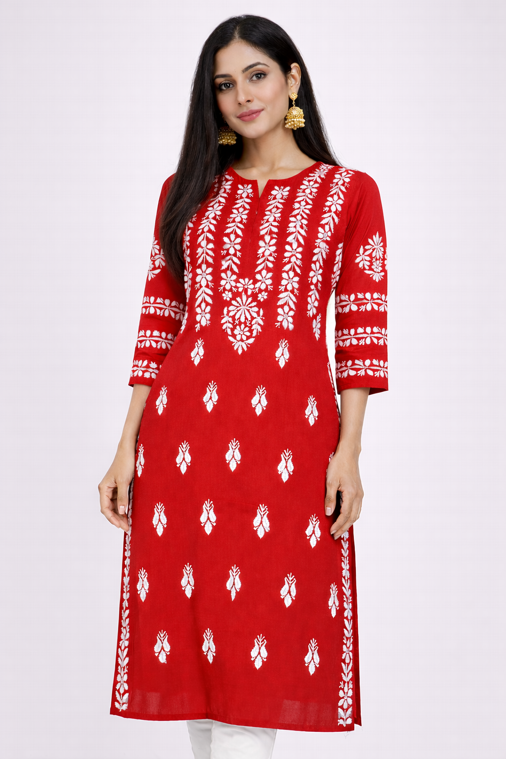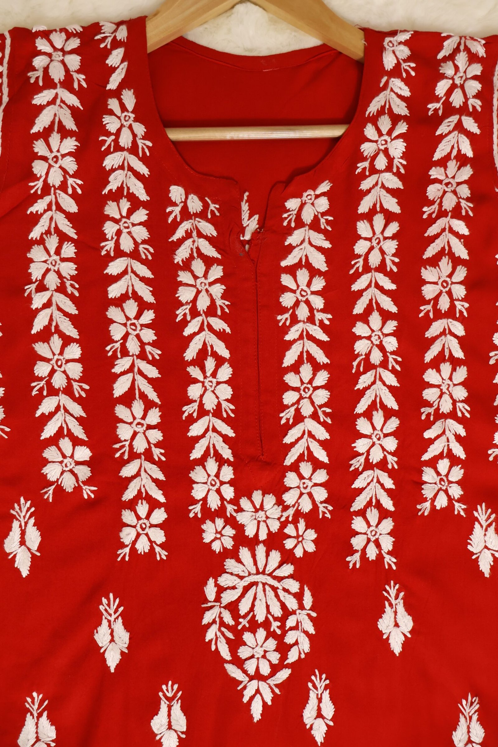 Bring home the timeless charm of traditional chikankari with this beautifully crafted Red Embroidered Kurti by PureWear Creations.