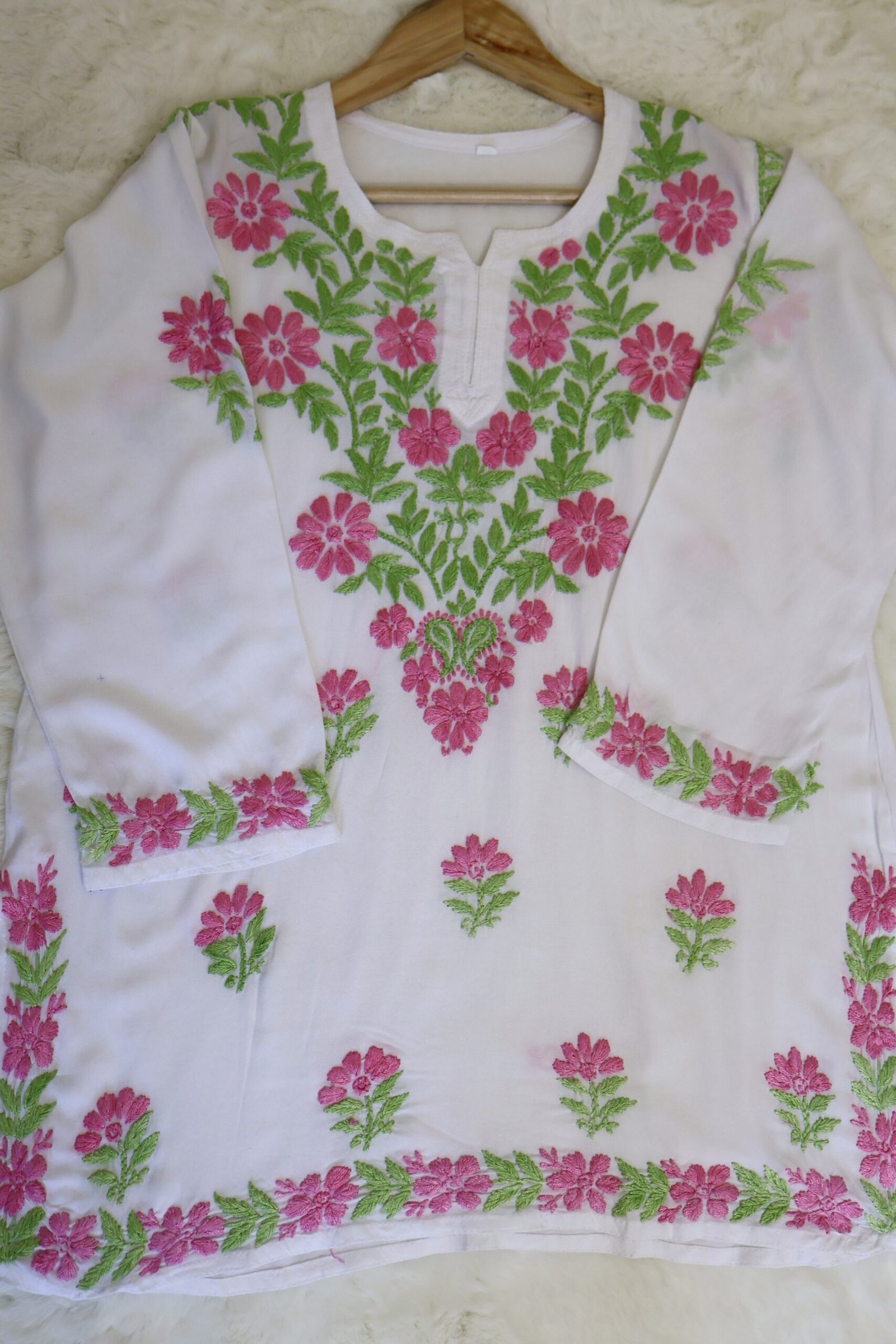 The soft pink and green thread embroidery creates a beautiful contrast against the pristine white base, giving the kurti a fresh and graceful look. The intricate handcrafted detailing highlights the fine artistry of skilled artisans, making each piece unique and full of traditional charm.