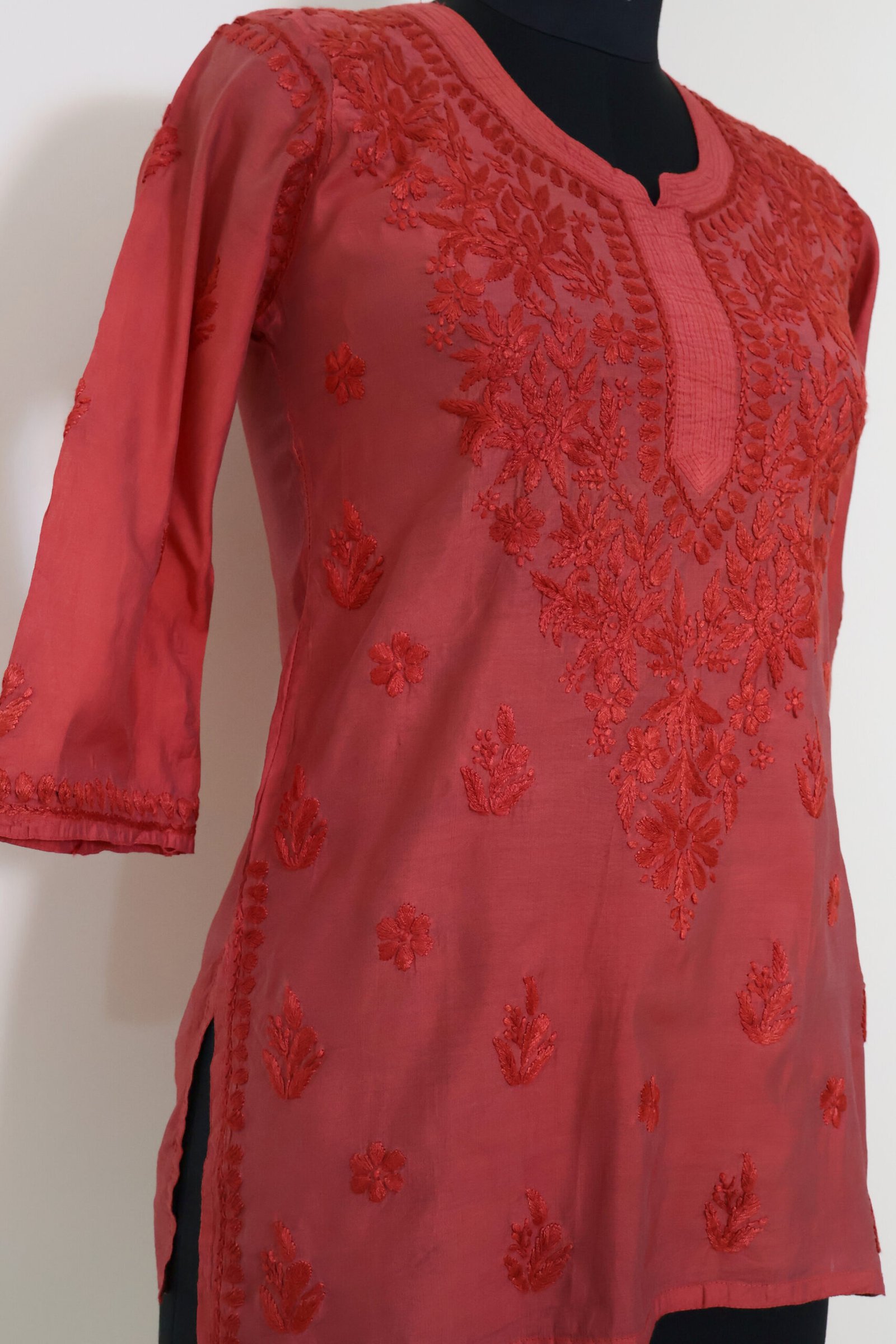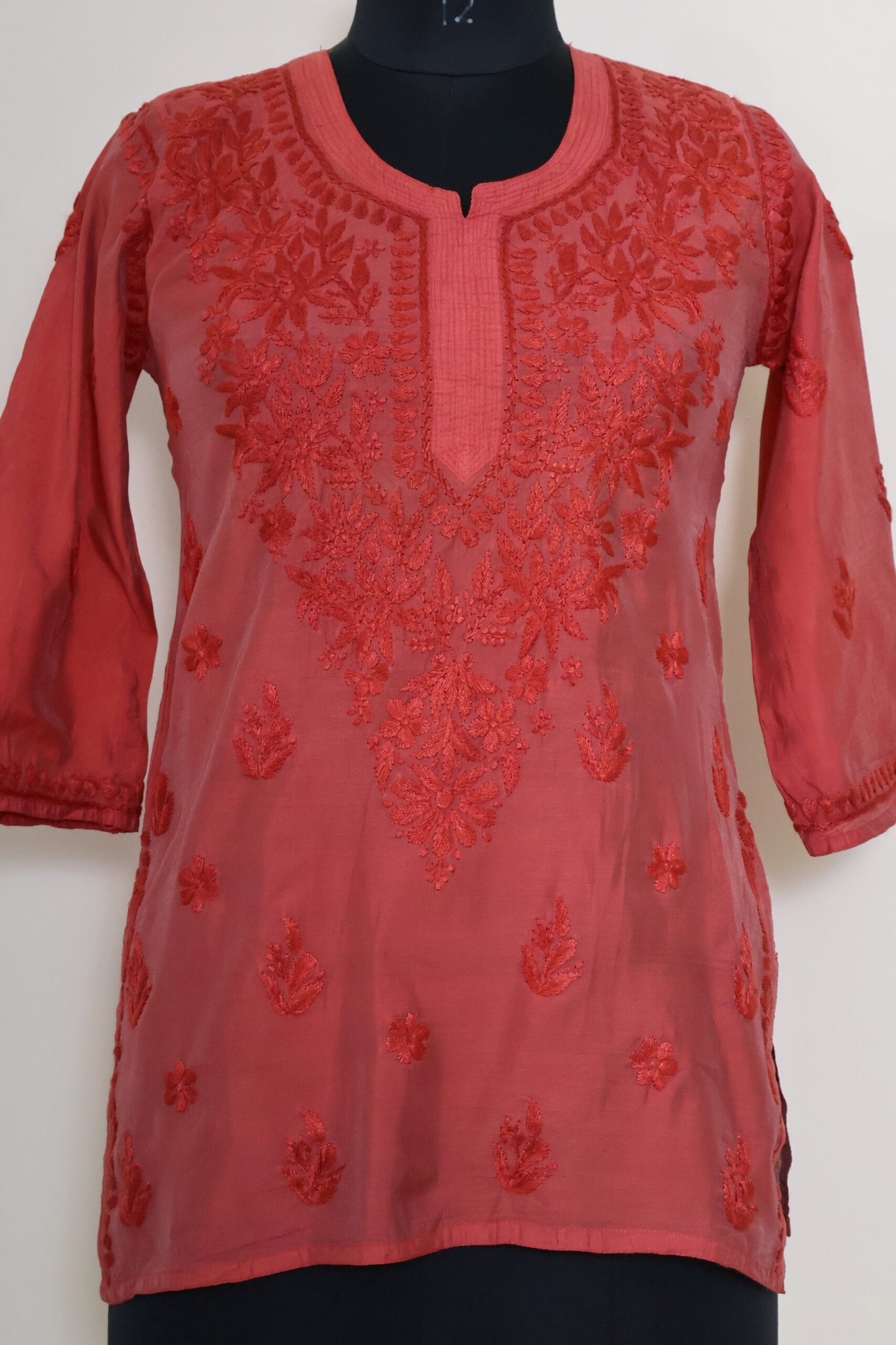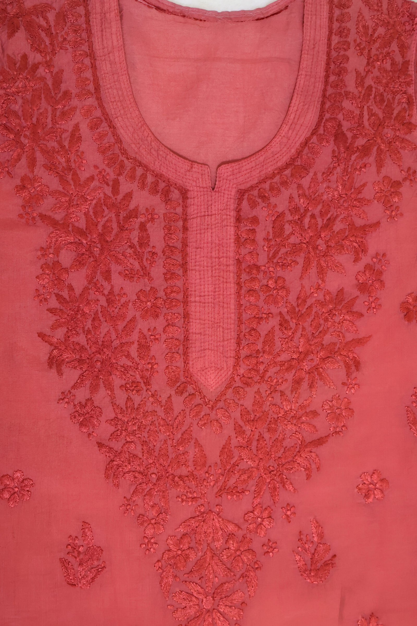 Add a vibrant touch to your ethnic wardrobe with this stunning Coral Red Short Kurti, beautifully detailed with intricate chikankari-style embroidery on the front panel and scattered motifs throughout.