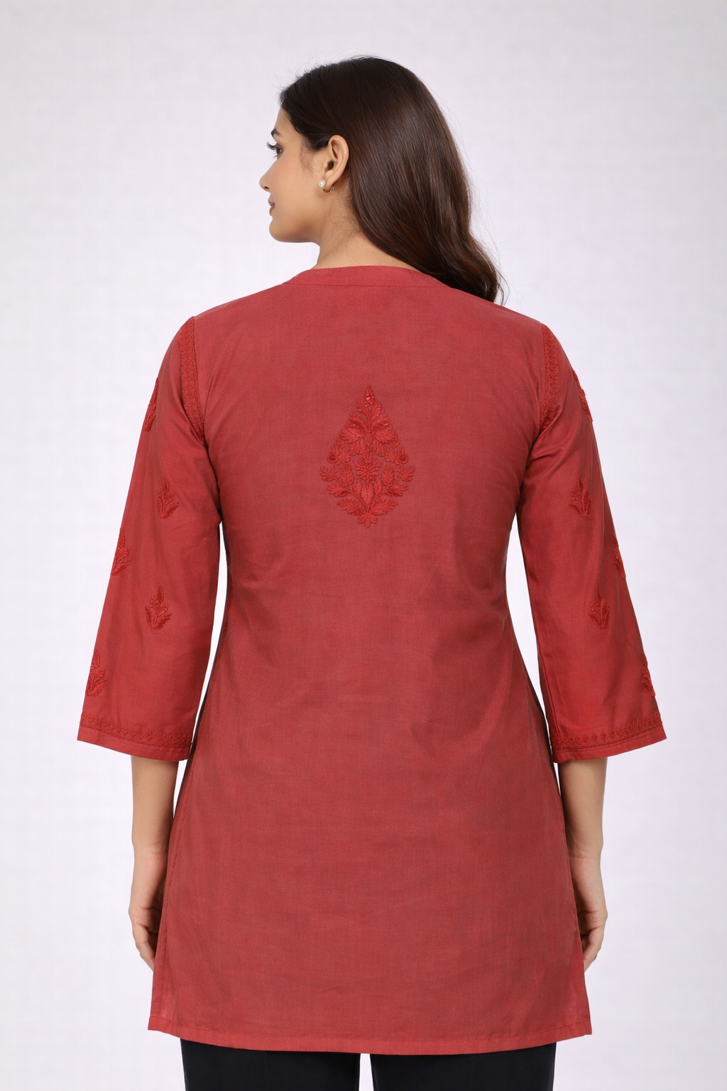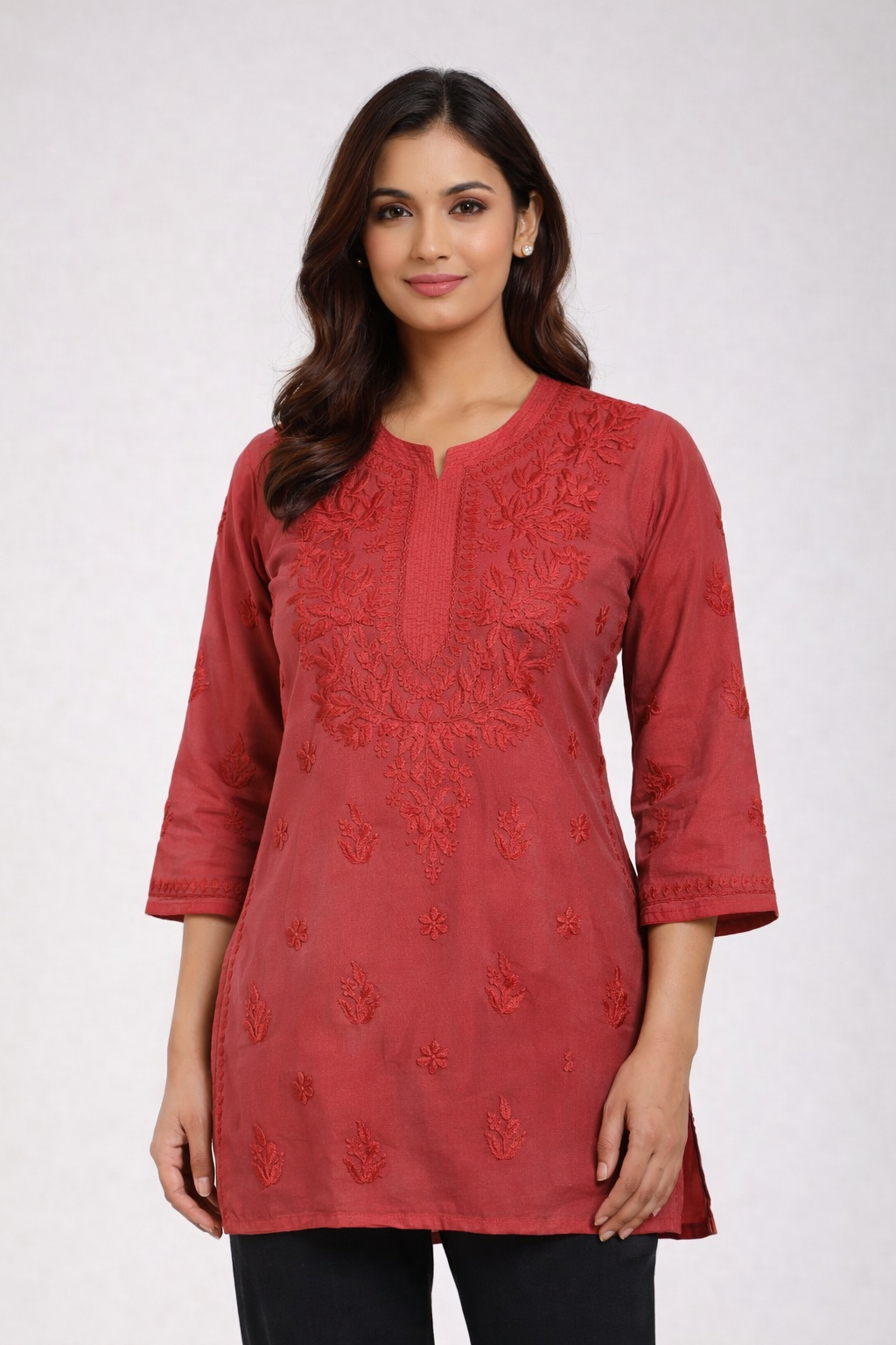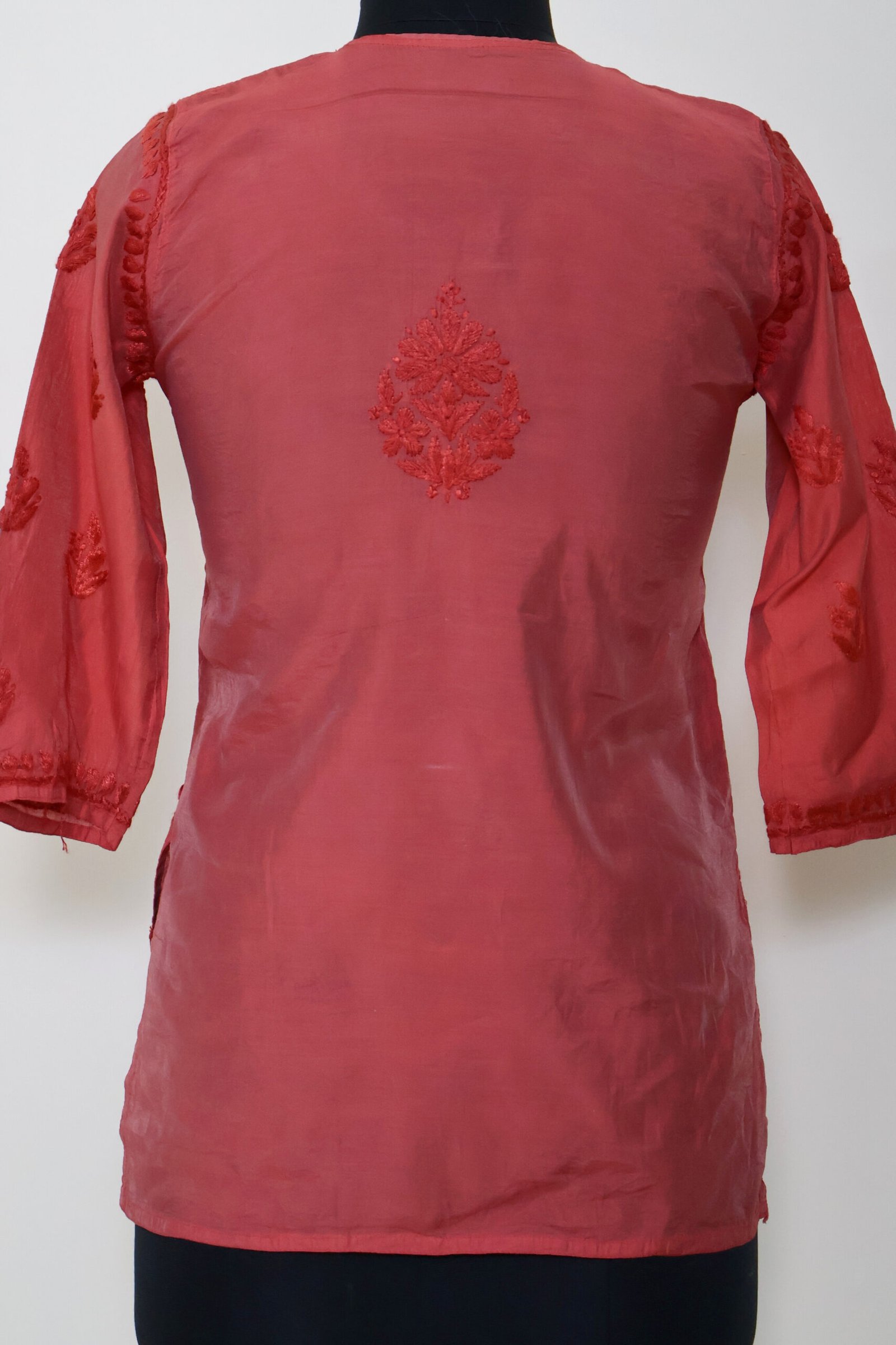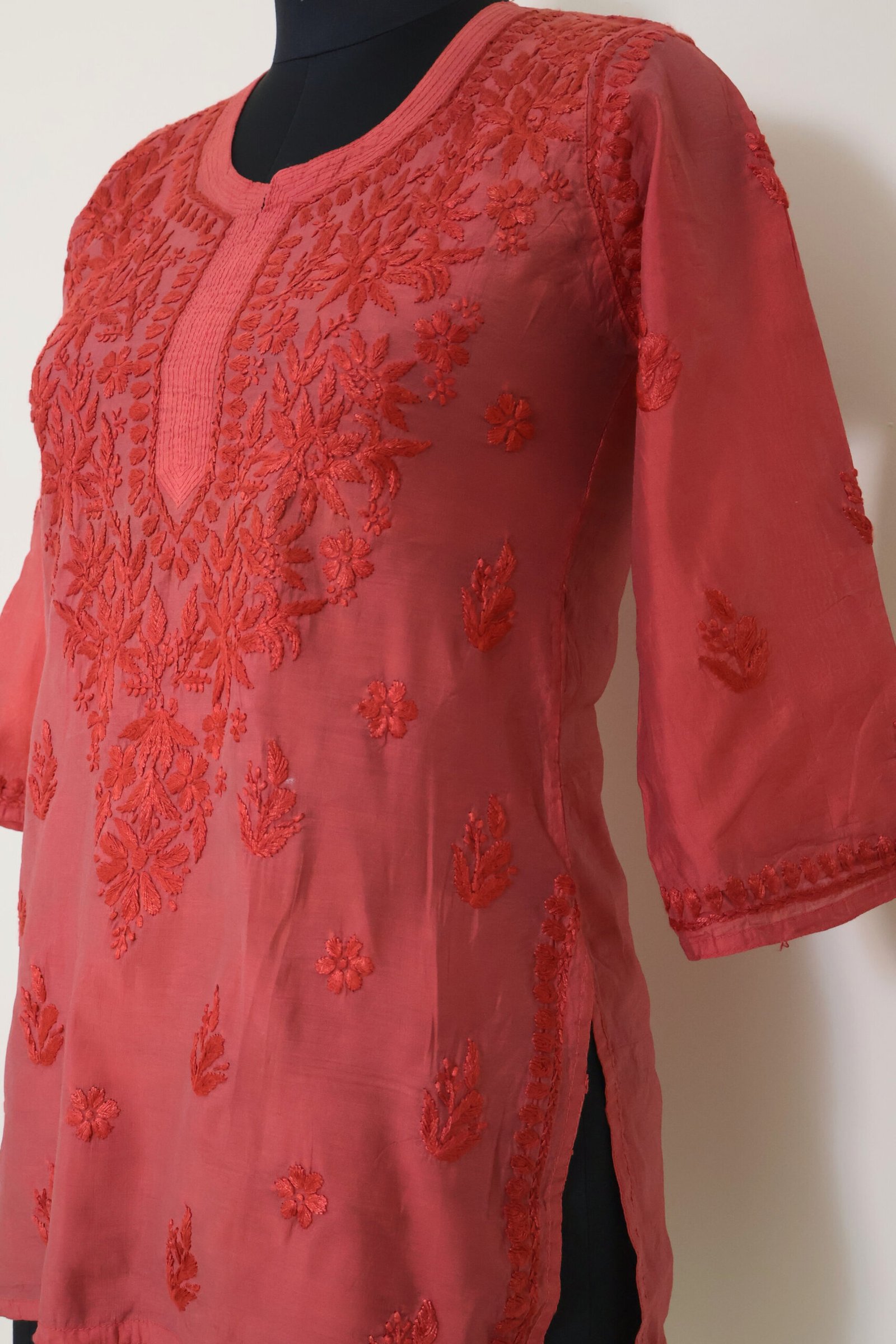 Add a vibrant touch to your ethnic wardrobe with this stunning Coral Red Short Kurti, beautifully detailed with intricate chikankari-style embroidery on the front panel and scattered motifs throughout.
