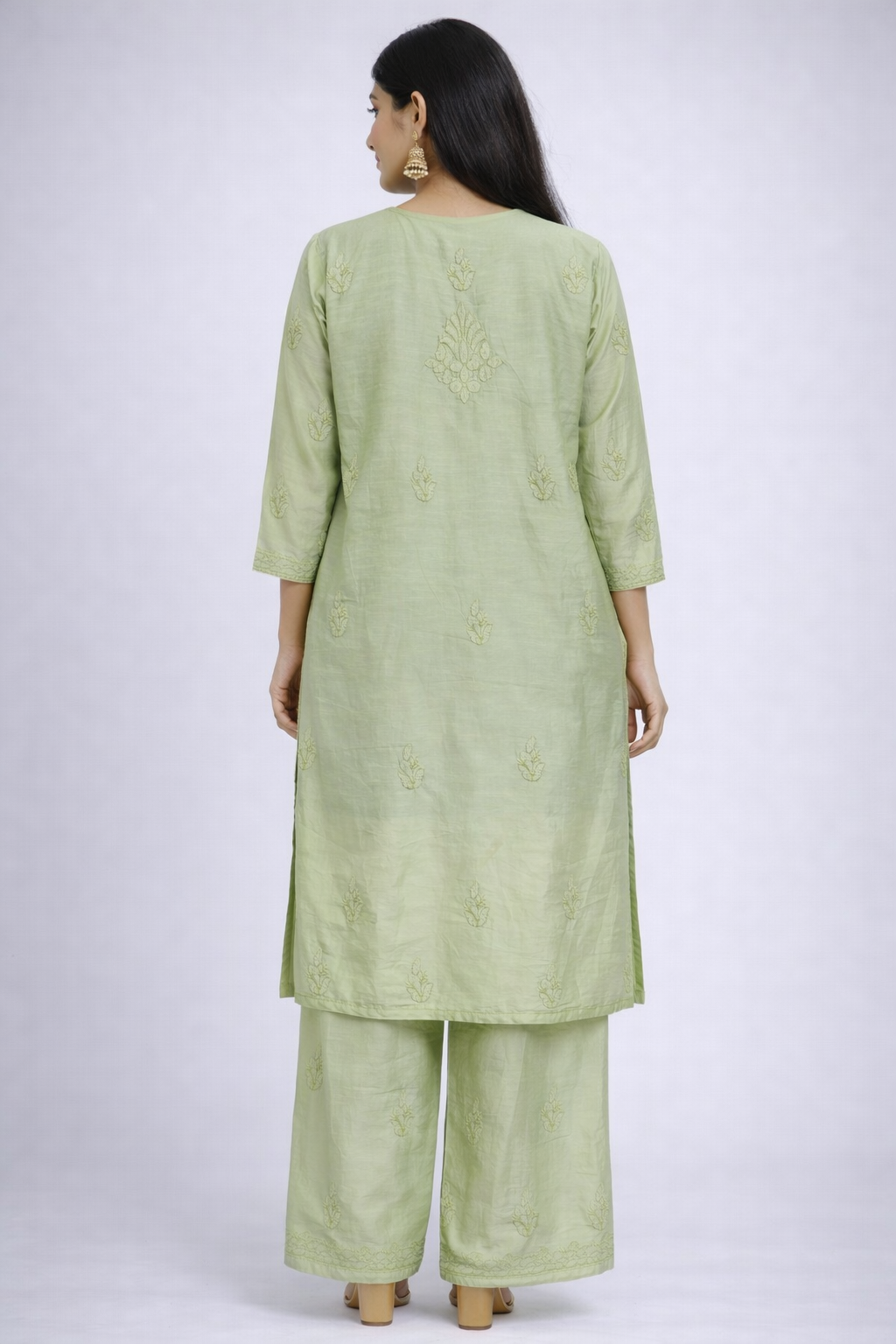 Elevate your ethnic wardrobe with this beautifully crafted sage green chikankari kurti set. Designed with detailed front embroidery and subtle motifs throughout, this set offers a perfect blend of grace and comfort.