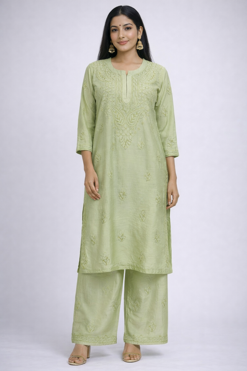 The straight-fit kurti features delicate thread embroidery around the neckline and chest, giving it a refined and premium look. Paired with coordinated embroidered palazzo pants, this outfit is ideal for office wear, casual gatherings, festive events, and everyday elegance.